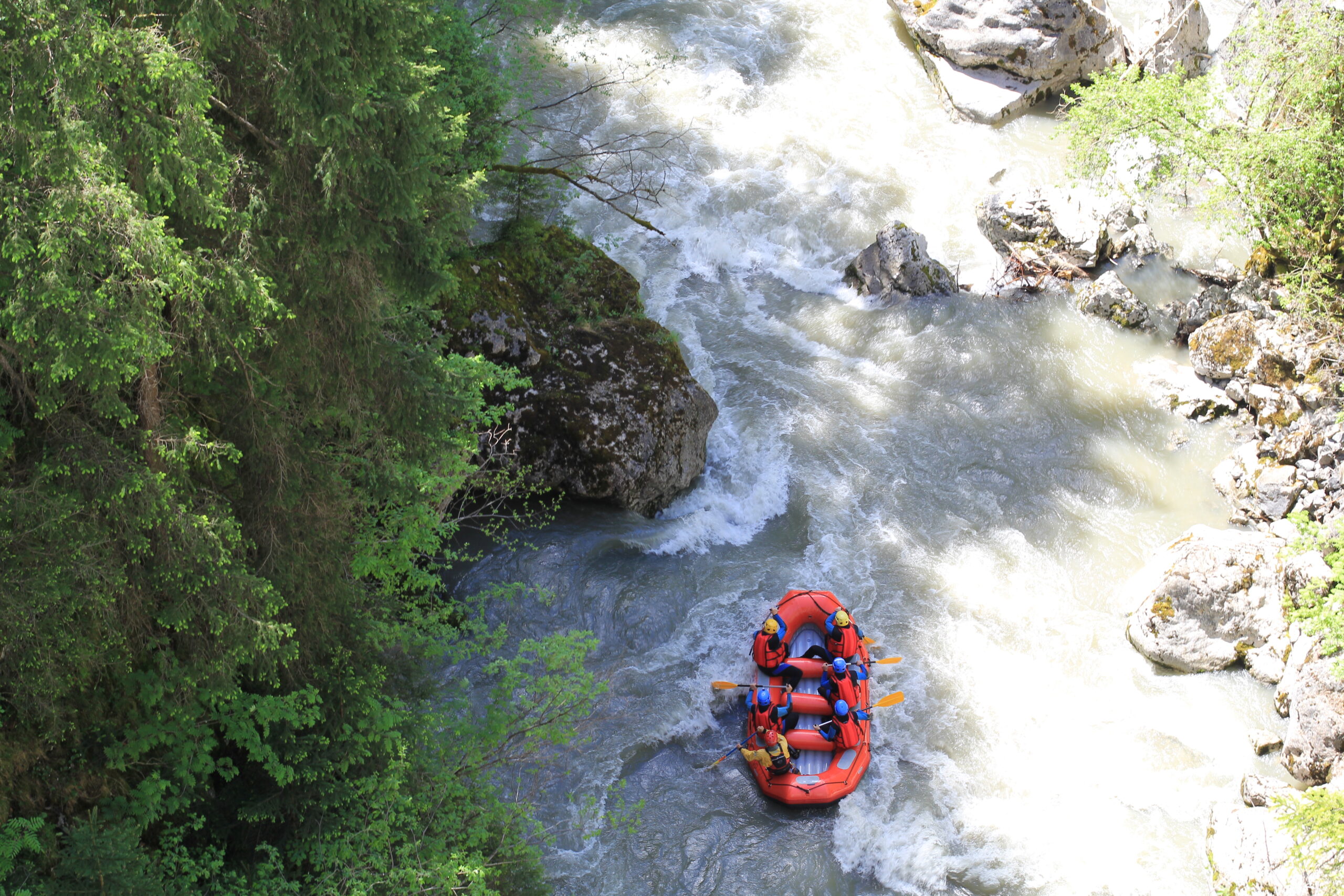 Au printemps, lorsque la neige fond et s’engage dans la Sarine, les conditions sont idéales pour s’élancer en eau vive. C’est la saison la plus dynamique pour ressentir toute la force du courant.